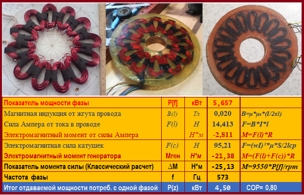 Как видно из расчета из общего момента силы генератора 21,4 Н *м, доля формирующего его от силы ампера составляет 2,8 Н*м (13%). Конструктивно в системе РОЛИКИ Момент силы от действия силы ампера увеличивается, но общий Электромагнитный момент генератора уменьшается при равнозначной выходной и полезной мощности генератора: