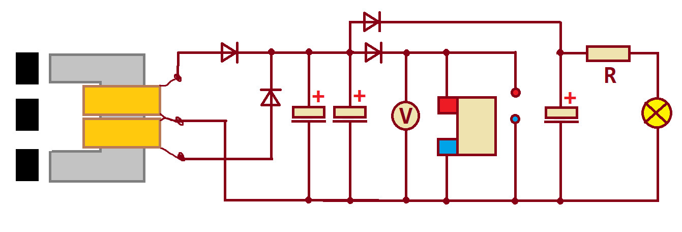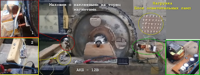 К сожалению автор не довел свою установку до логического конца, "споткнувшись" именно на генераторе. Первое его ошибка при изменении параметров генератора, что он не менял ротор оставив магнитную индукцию на том же месте, а удлинил провод уменьшил его сечение. В итоге он получил необходимую ЭДС (вольтаж холостого хода) но исключил возможность получения нужного параметра тока в жиле. А нужно было или увеличить магниты изменив конструкцию ротора или добавить еще один узел разгонного модуля по технологии ПУШ-ПУЛ дабы увеличить скорость вращения массы маховика.