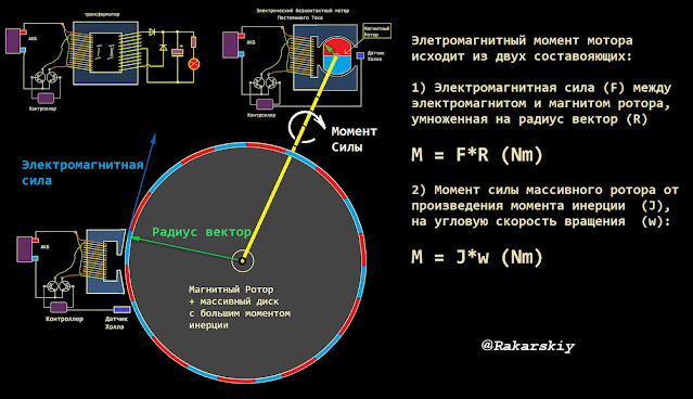 Если учесть, что моторный электромагнит и П-образный сердечник находится на одном удалении от оси, рычаг исключен в априори момент передачи 1:1. Остается только параметры инерции и момента силы ротора-маховика. Приблизительно его вес 35 кг. толщина и ширина обода по 5 см (50 мм). Проверим его момент инерции