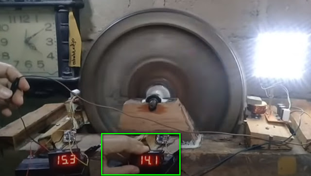 Хороший пример использования массивного инерционного ротора в системе мотор генератор. Автор демонстрирует вращение ротора затраты на подкрутку-вращение и съем для подзаряда батареи и нагрузку в виде лампочек. Длительное время напряжение в цепи с "мотором", "генератором", АКБ и нагрузкой держится в мерности 12,3 В. При этом ротор вращается с устойчивым угловым моментом скорости (затраты на вращение), Горение лампочек нагрузки (затраты нагрузки). В данном случае АКБ является буферным источником напряжения в данной цепи.