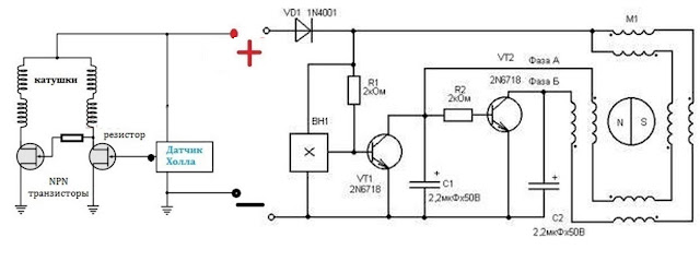 Если смотреть в левый угол картинки находится две катушки возможно на одном сердечнике, которые имеют модуль управления через датчик холла. Первая предположительная схема, вторая альтернативная, обе широко распространены.